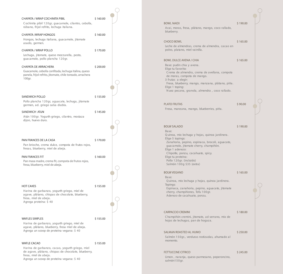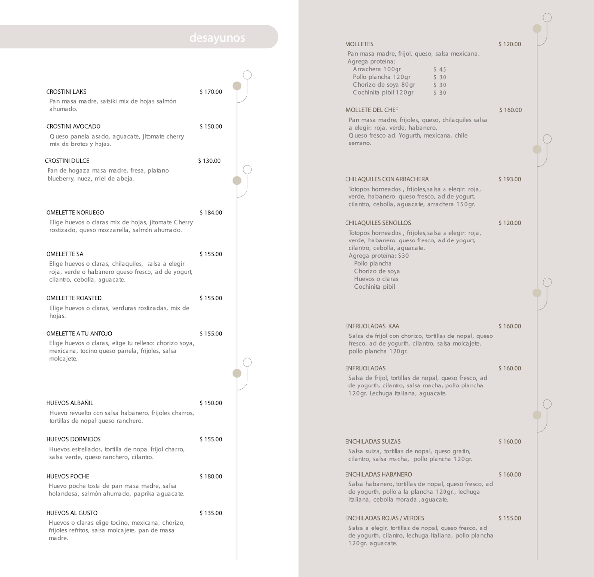 Pan masa madre, frijoles, queso, chilaquiles, salsa a elegir, queso, aderezo de yogurt natural, preparación mexicana con chiles de temporada y chile serrano, porción personal.